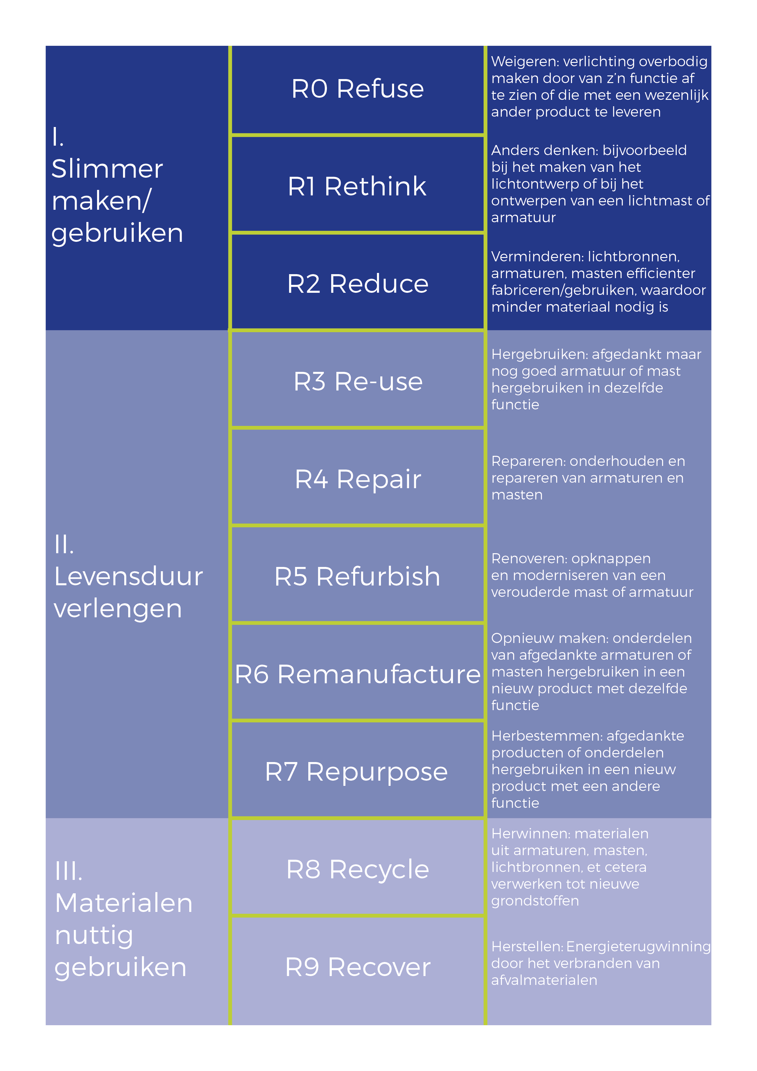 Retrofit is een strategie die terug te vinden is op de zogenaamde R-ladder. Deze ladder bestaat uit principes, allen beginnend met een R en oorspronkelijk bedacht door de Ellen MacArthur foundation. De principes geven invulling aan de circulaire ambitie: waardebehoud van grondstoffen. Retrofit is één van de methodes om de waarde van grondstoffen te behouden. De armatuur hoeft namelijk niet weggegooid te worden als de lichtbron niet meer voldoet. Met een LED-lichtbron kan de armatuur nog jaren vooruit.